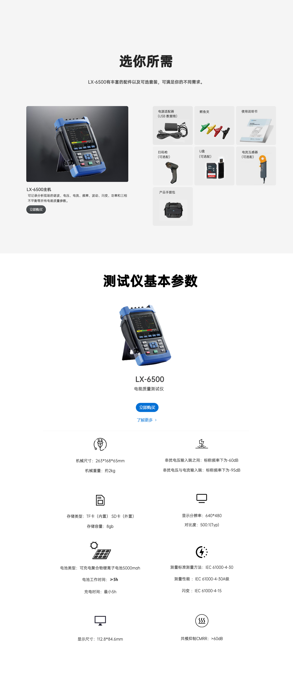 LX6500手持式電能質量分析儀|功率分析儀,它可記錄分析現場的諧波、電壓、電流、頻率、波動、閃變、功率和三相不平衡等所有電能質量參數,同時具備電 能瞬態監測、錄波分析、能效損耗評估、逆變器測量等高級測量功能。測量結果提供免費的上位機分析軟件進行二次分析,為電網電能質量治理提供準 確的數據依據。