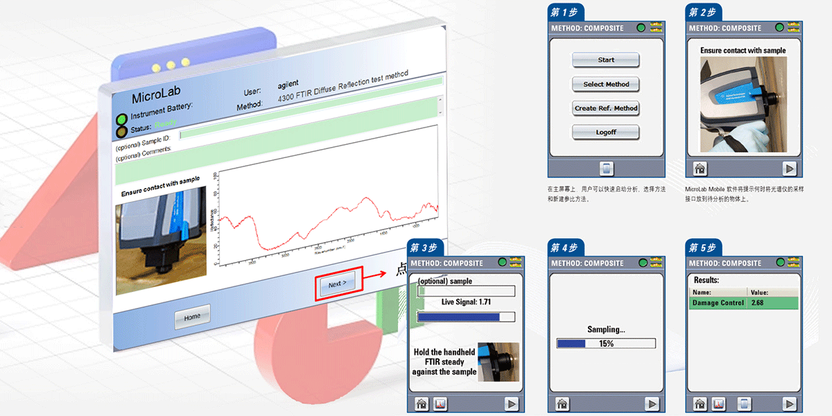 配備 MCT 檢測器的手持式 FTI 將 MCT檢測器的快速測量能力與軟件的快速響應和優化人機工程學設計相結合,能夠快速而輕松地在完成多點分析。Agilent MicroLab Mobile 測量軟件可增強便攜式和手持式光譜儀的功能。它的實時光譜顯示完美補充了MCT 系統的快速掃描功能