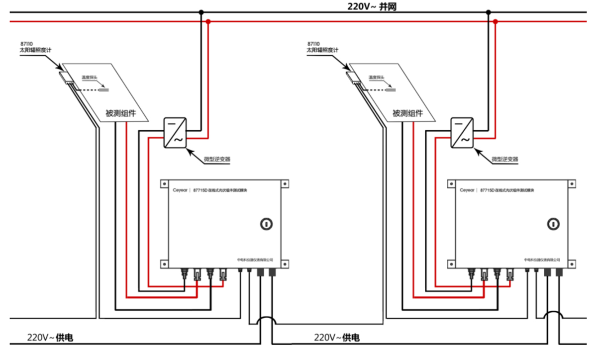- 支持87110B太陽輻照度計一同組網,實現對被測組件輻照度、溫度的監測。
