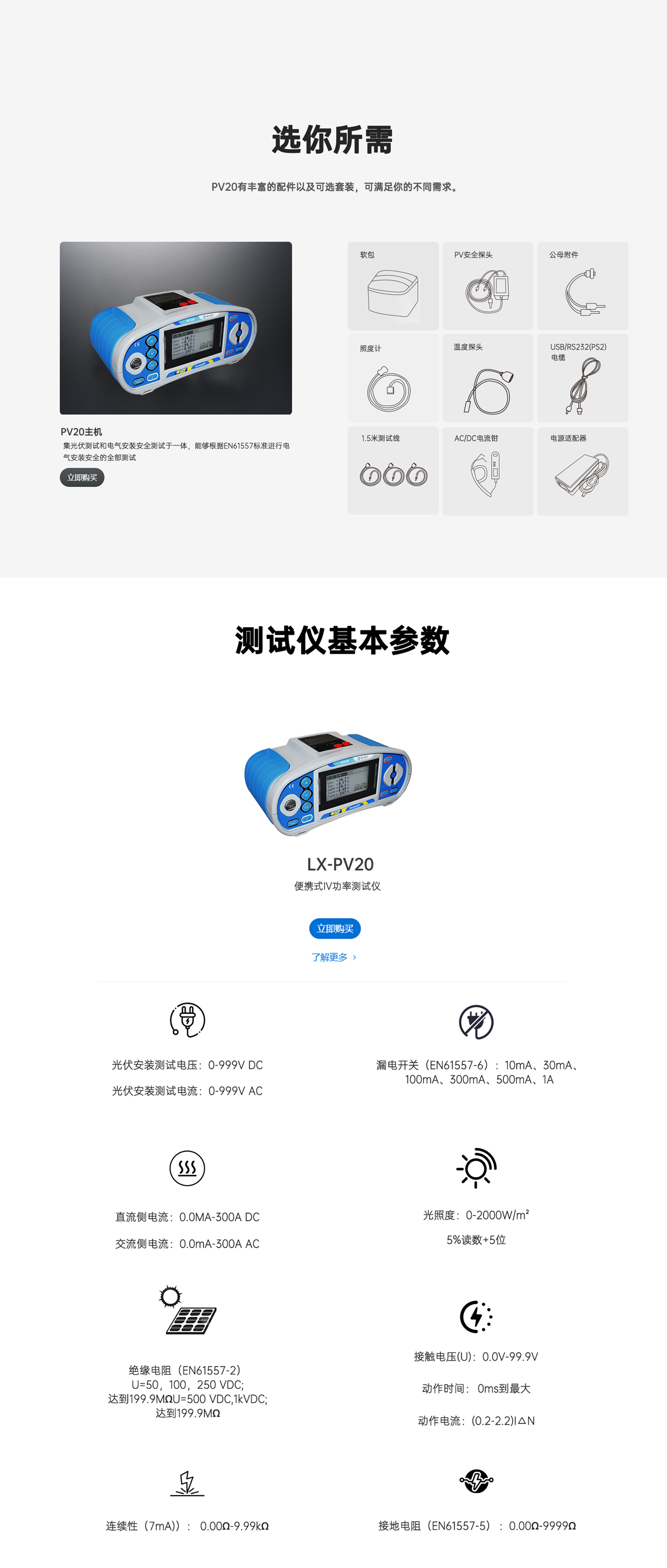 光伏組件綜合測試儀LX-PV20的直流工作條件是電壓達1000V,電流15A。采用光伏專用安全探頭保證操作人員的安全。