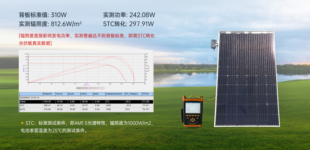 組件功率測試儀為標(biāo)準(zhǔn)組串式功率測試儀,可精準(zhǔn)的完成單組件到組串的功率檢測以及IV曲線測試,STC下的標(biāo)準(zhǔn)功率轉(zhuǎn)化率,中文版系統(tǒng)操作便捷,攜帶方便,且配備高精度輻照度計(jì)與溫度傳感器,快速精準(zhǔn)的檢測效率可作為第三方檢測機(jī)構(gòu)與電站運(yùn)維的首選型號。